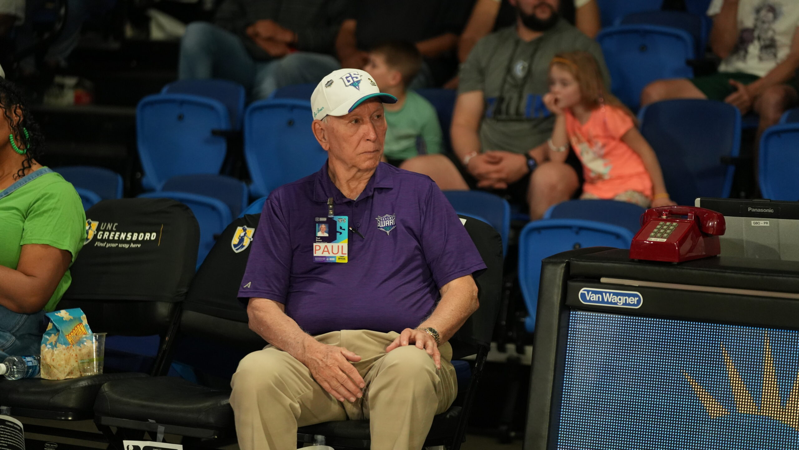 Brown, the team’s official stat runner, can often be seen darting back and forth during timeouts and stoppages, delivering box scores that inform decisions for both the home and visiting teams and helping supply water for officials. He has been the Greensboro Swarm’s stat runner since the franchise’s inaugural 2016 season, when he was 81. Now, at 92, Brown beams with pride when reflecting on his decade-long dedication – out of more than 200 Swarm home games, he hasn’t missed a single one.