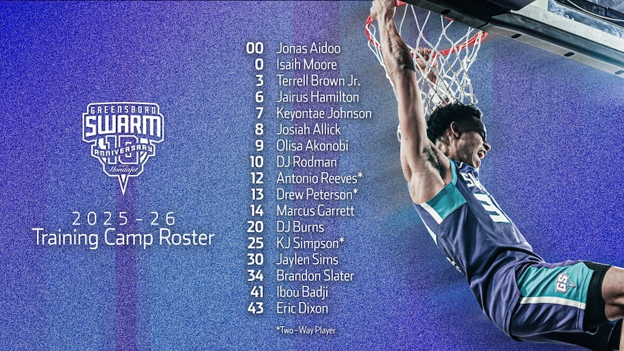 The Swarm’s 17-man training camp roster includes three two-way Charlotte Hornets players in KJ Simpson, Drew Peterson and Antonio Reeves and five Swarm returners: Keyontae Johnson, Terrell Brown Jr., Marcus Garrett, Isaih Moore and the Swarm’s all-time leading scorer, Jaylen Sims.