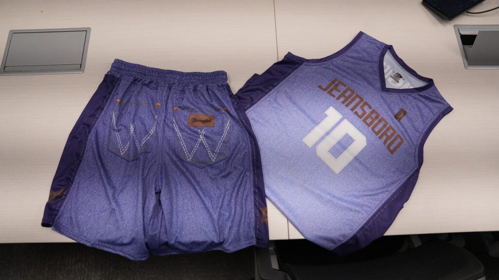 The team’s custom jersey features a denim-inspired blue base with textured detailing, crisp white numbering and “Jeansboro” lettering across the chest. A Wrangler logo and subtle design accents pay tribute to Greensboro’s historic role in the global denim industry, blending basketball culture with the city’s tradition of craftsmanship.